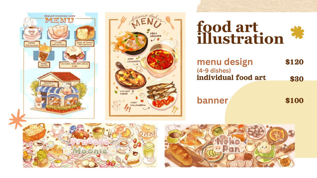 - for menu designs, you can add some name plates or price tags if you want one. it is usually in A4 canvas size and the dishes being spread out. you can see some samples in my portfolio :D- for badges, the final file includes resized versions for twitch (72px, 36px, 18px), along with original res files which is 3000px. commercial rights are also included in the price!